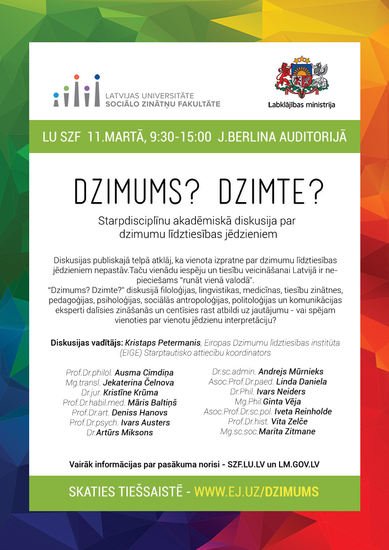 2016.gada 11. martā, no plkst. 9:30 līdz 15:00 Latvijas Universitātes Sociālo zinātņu fakultātē notika akadēmiska starpdisciplināra diskusija par dzimumu līdztiesības jēdzieniem "Dzimums? Dzimte?". Atšķirības priekšstatos par to, uz kas ir un kā izpaužas dzimumu līdztiesība un dažādos skatījumus uz šķietami saprotamiem jēdzieniem apgrūtina iespējas uzsākt pilnvērtīgu diskusiju un risinājumu meklēšanu konkrētām problēmām. Lai veicinātu plašāku sabiedrības iesaisti dzimumu līdztiesības problēmu aktualizēšanā ir nepieciešams „runāt vienā valodā” par ar dzimumu līdztiesību saistītajiem pamatprincipiem un jēdzieniem.